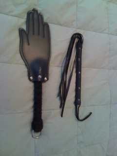 When you start spanking with toys you may want to consider milder implements first. The leather hand looks formidable it is not really too fierce, and is advertised as a replacement for when your hand gets tired. A leather flogger with just a few strands used gently can be very stimulating. The long handled thing that looks like a bath brush is definitely gentle. The head is foam and it is used to apply lotion to those areas that are hard to reach.