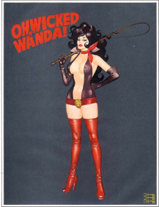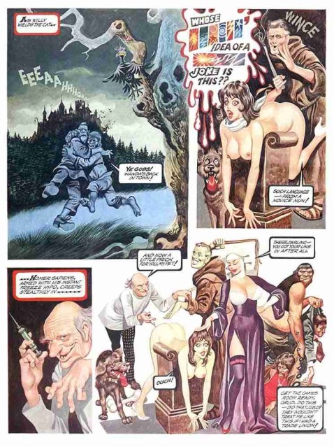 Oh, Wicked Wanda! was a British full-color, satirical adult comic strip, written by Frederic Mullally, and drawn by Ron Embleton. The strip regularly appeared in Penthouse magazine from 1973 to 1980 from Wikipedia. Wanda often called her “Pusscake”, while Candyfloss’ nickname for Wanda was “Boo’ful.” The term “candyfloss” is the common UK name for “cotton candy.” Candyfloss was apparently omnisexual, shagging with anyone who came her way, much to Wanda’s annoyance.There was a full archive of all the strips online but it seems to be gone. Here is a selection of my favorite panels.