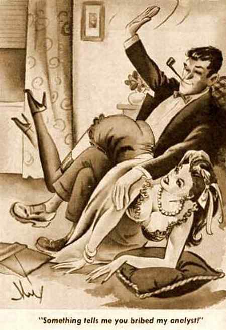 I enjoyed your version as well as Bonnie’s. Spanking song parodies always make me laugh! The cartoon referencing the bribed analyst is by Kirk Stiles (it’s been reversed making the signature harder to recognize) who also did two others involving spanking psychoanalysts. It dates from 1959 and I believe Stiles modeled the spanker on Hugh Hefner!